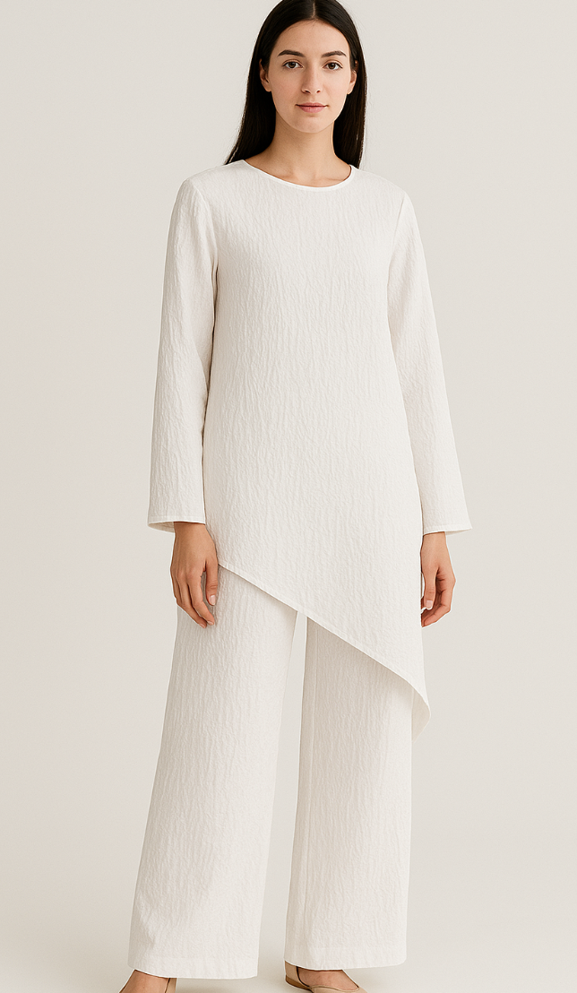 The Serene Two Piece Set combines effortless elegance with contemporary design. This modest ensemble features a flowing maxi top paired with wide-leg pants, both crafted from a luxurious tencel blend that creates a distinctive crinkled texture. The patterned fabric adds visual interest while maintaining a refined aesthetic. The top ties at the back for a customisable fit and flattering silhouette. Elevate your look by pairing with the coordinating gold metal brooch, sold separately, for added sophistication and polish.